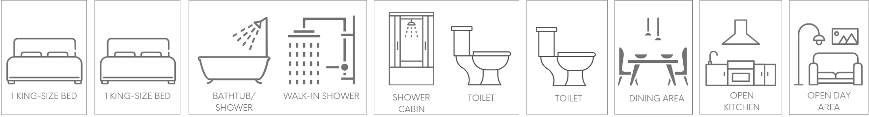 seamlessly blends with a fully loaded counter-kitchen and a chic dining area. Towards the rear of the apartment facing a quiet inner city courtyard, you’ll find the two bedrooms, each one of them fitted with a king-size bed, with one of the bedrooms leading to a balcony. The two and a half bathrooms are the main bathroom with a double vanity, walk-in shower and a bathtub/shower. The second bathroom is fitted with a shower cabin, vanity and toilet flanked by our second half bathroom consisting of a vanity and toilet.